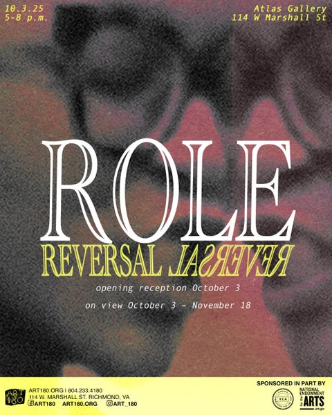 Role Reversal, a new group exhibition, is on view at ART 180's Atlas Gallery, now through November 18, with work by artists from across ART 180’s collective. A public closing reception will be held at our Atlas gallery, from 5-8 p.m., on Friday, November 7, as part of RVA First Fridays. The show highlights the dissonance created by professional expectations that force individuals to diminish themselves in the service of professionalism.